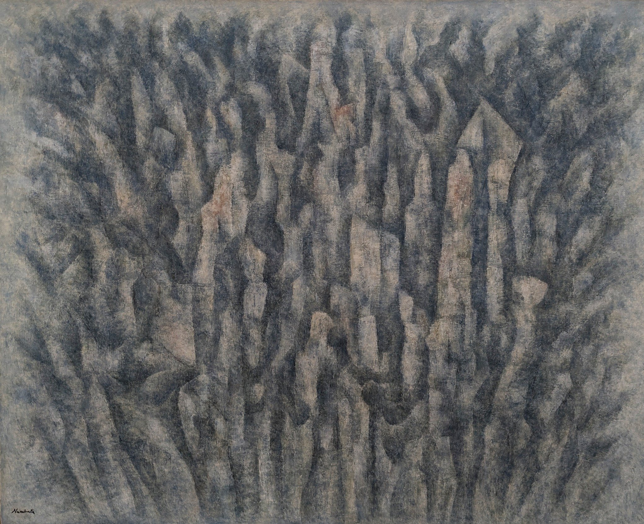 難波田龍起の抽象絵画が、欧米の抽象絵画の画家たちと違うと感じさせるのは、欧米の抽象画家たちが、対象のデフォルメもしくは、自分自身の印象を表現していると感じられるのに対して、難波田氏は、彼の目には、本当にそのように世界が見えているのではないかと感じられてくることであり、同時に、古代人の目にも、世界はこのように見えていたのではないかと、ふと思ったりする瞬間があることだ。