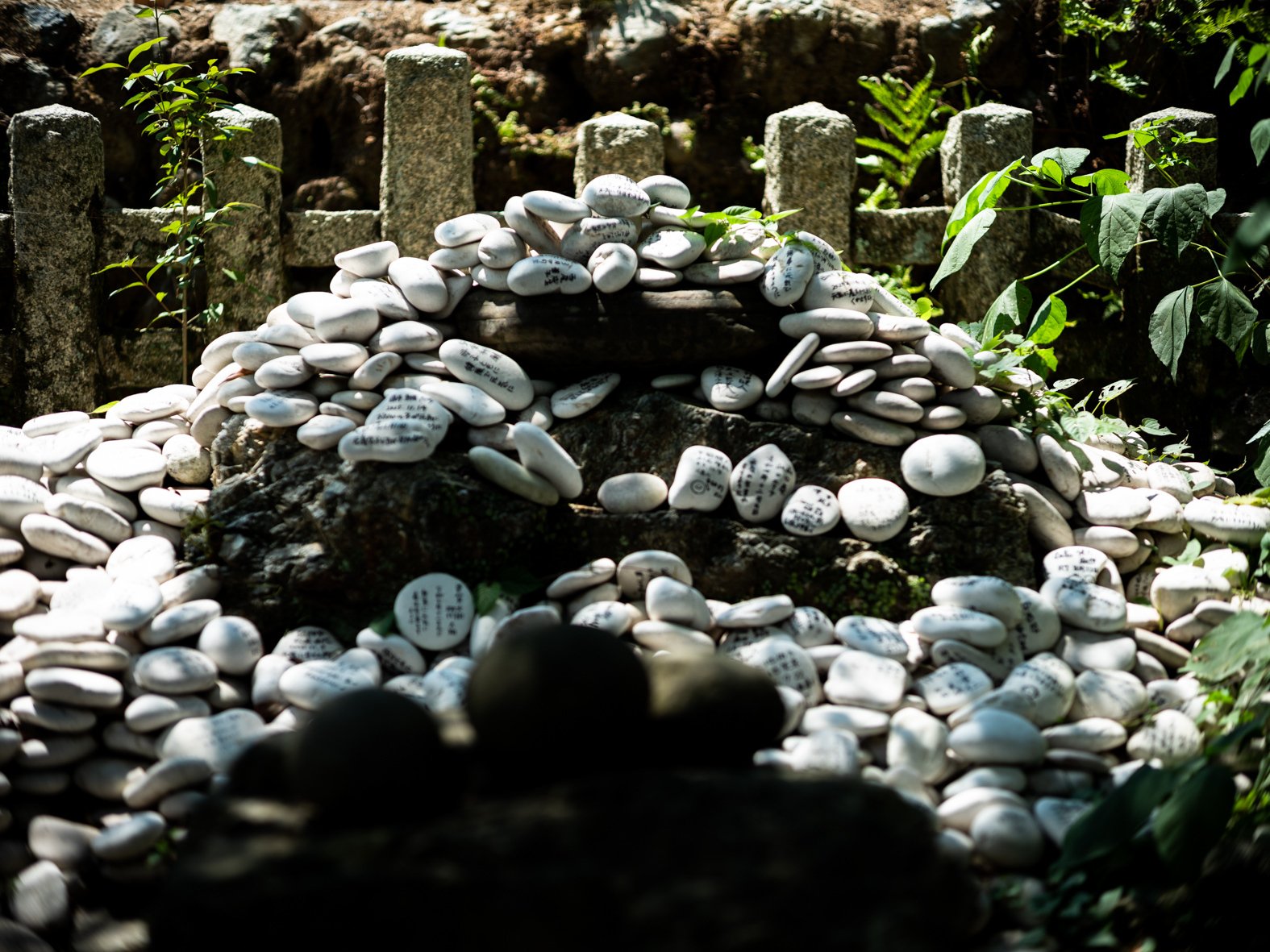 これは、今では安産のための聖域となってしまっており、安産祈願のためにこの神社を訪れた人が、歴史的背景のことなど何も知らないまま白い石を買って名前を書き込み、月延石の周りに膨大に積み上げている。