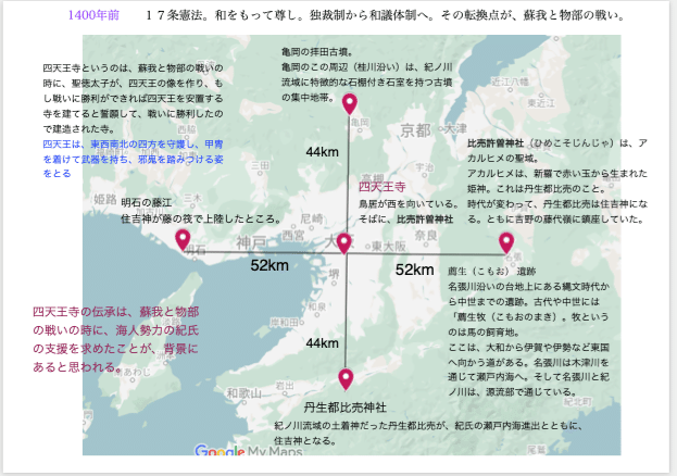 このように、四天王寺は、紀氏海人勢力と関わりの深い四方をつなぐ場所で、新羅から日本に戻ってきたアカルヒメの聖域のそばに築かれている。