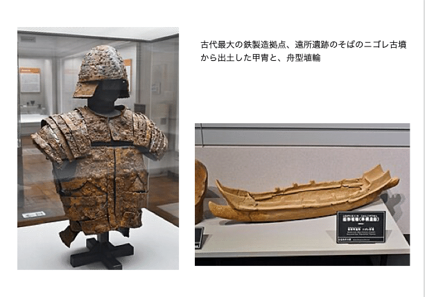 そして、この竹野の間人から竹野川を8kmほど遡ったところにニゴレ古墳がある。5世紀中頃の古墳とされるが、舟形木棺に埋葬され、頭位から完形の鉄製甲冑、左側から刀剣、足位から鉄鏃束がそれぞれ副葬品として出土した。さらに、海上交通を示唆する準構造船を模した船形埴輪が出土したことで注目されている。