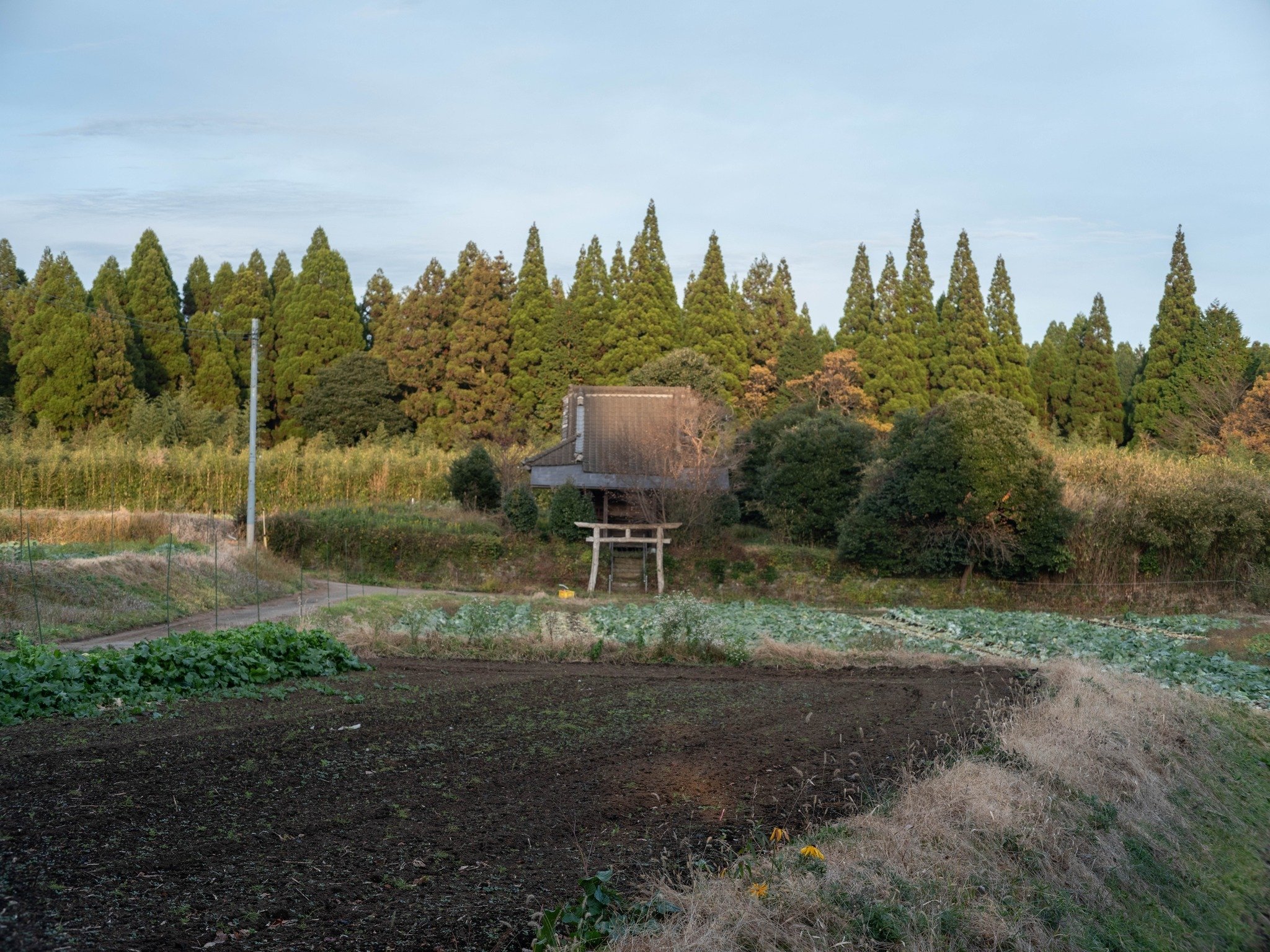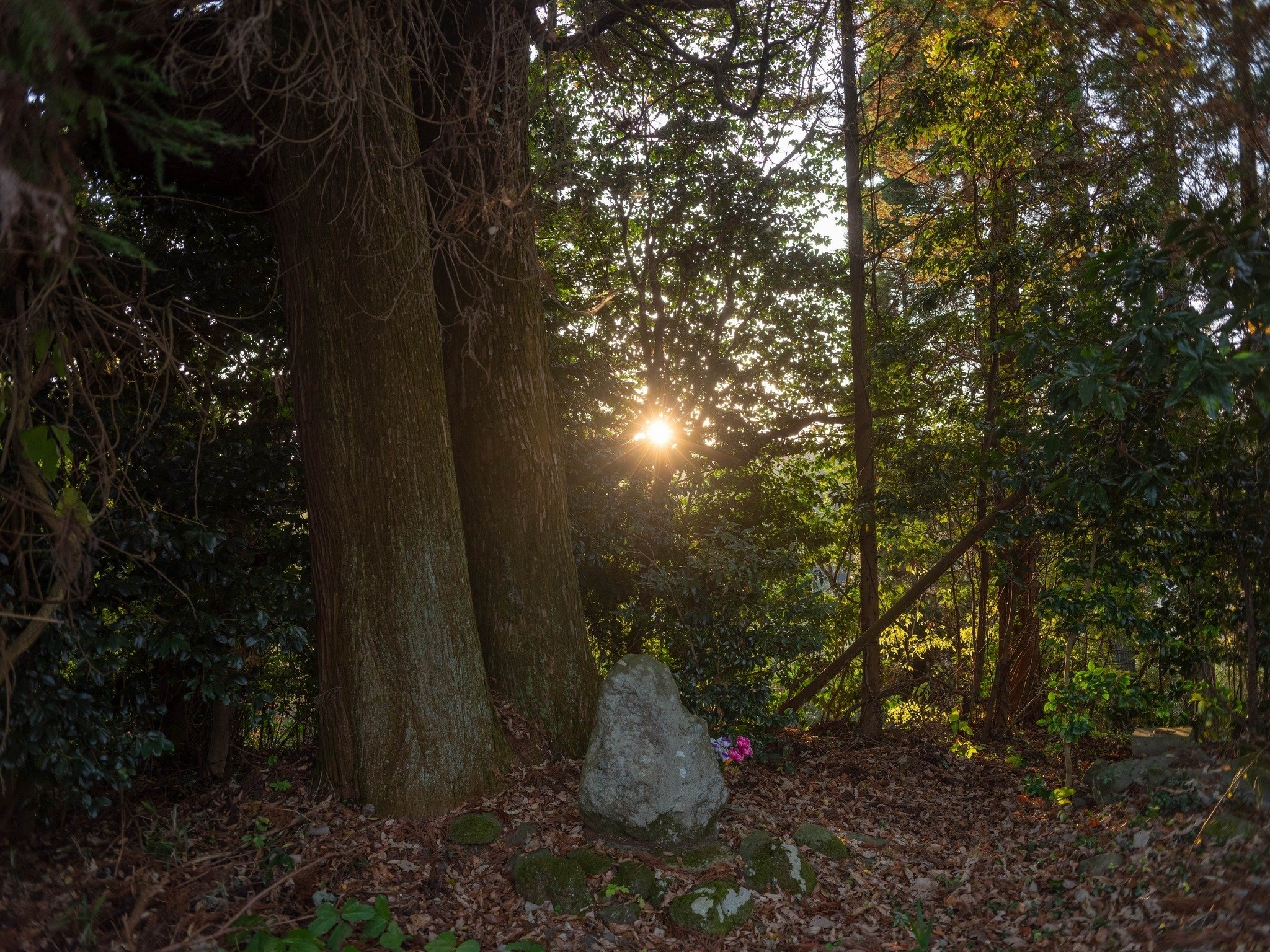 ちょうど自分が那須与一の墓の前に立っている時に、太陽の光が差し込んできたので、かなり驚いたのだが、さらに、この墓の近くの阿弥陀如来の聖域である社が、与一の墓の真正面、この冬至のライン上であり、日没の太陽が屋根をうっすらと照らし出していた。