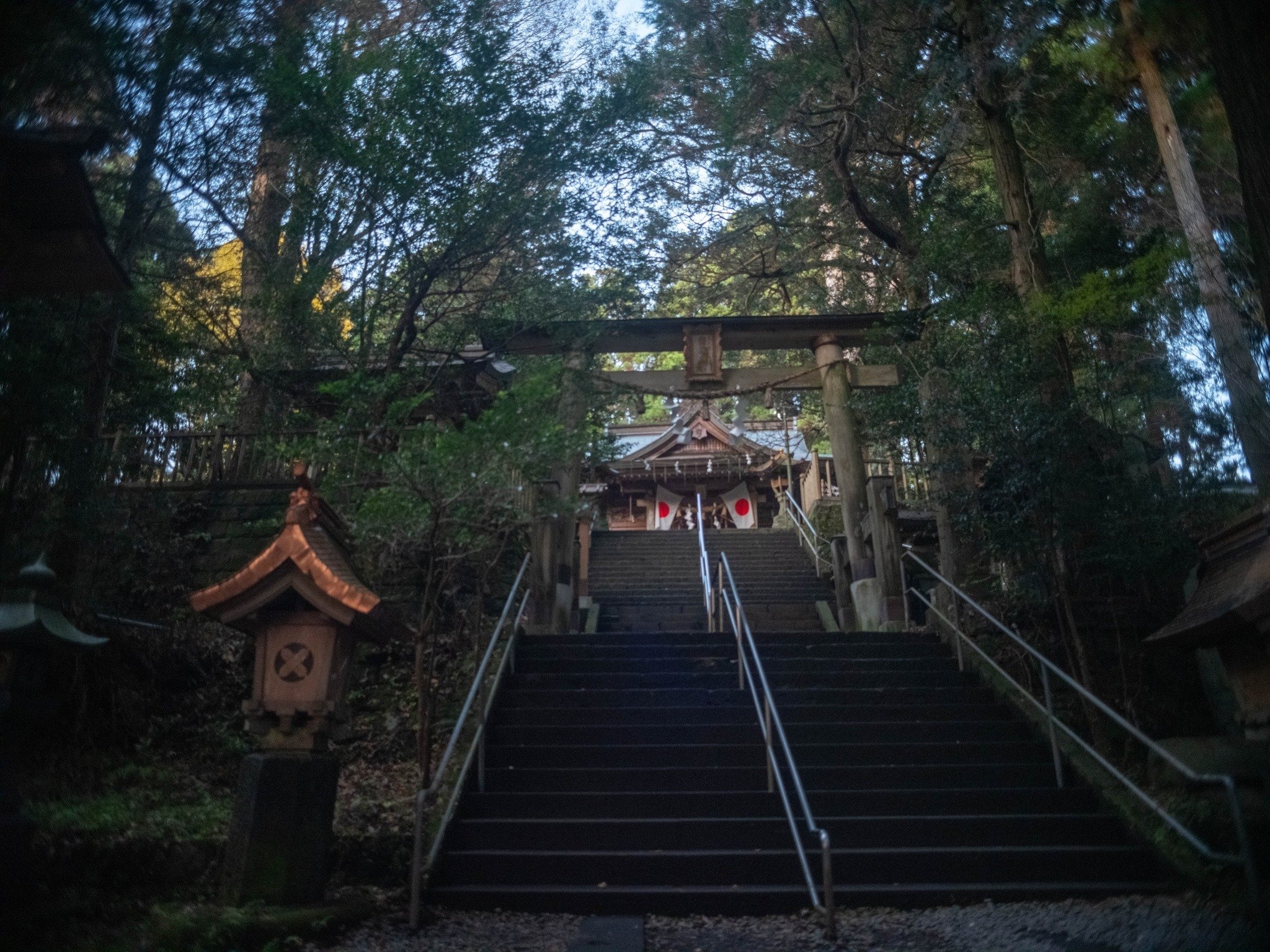 闇に包まれていく境内で、森の中を巡りながら、神域に湧き出る泉と、先祖代々の宮司を祀る聖域を訪れた。
