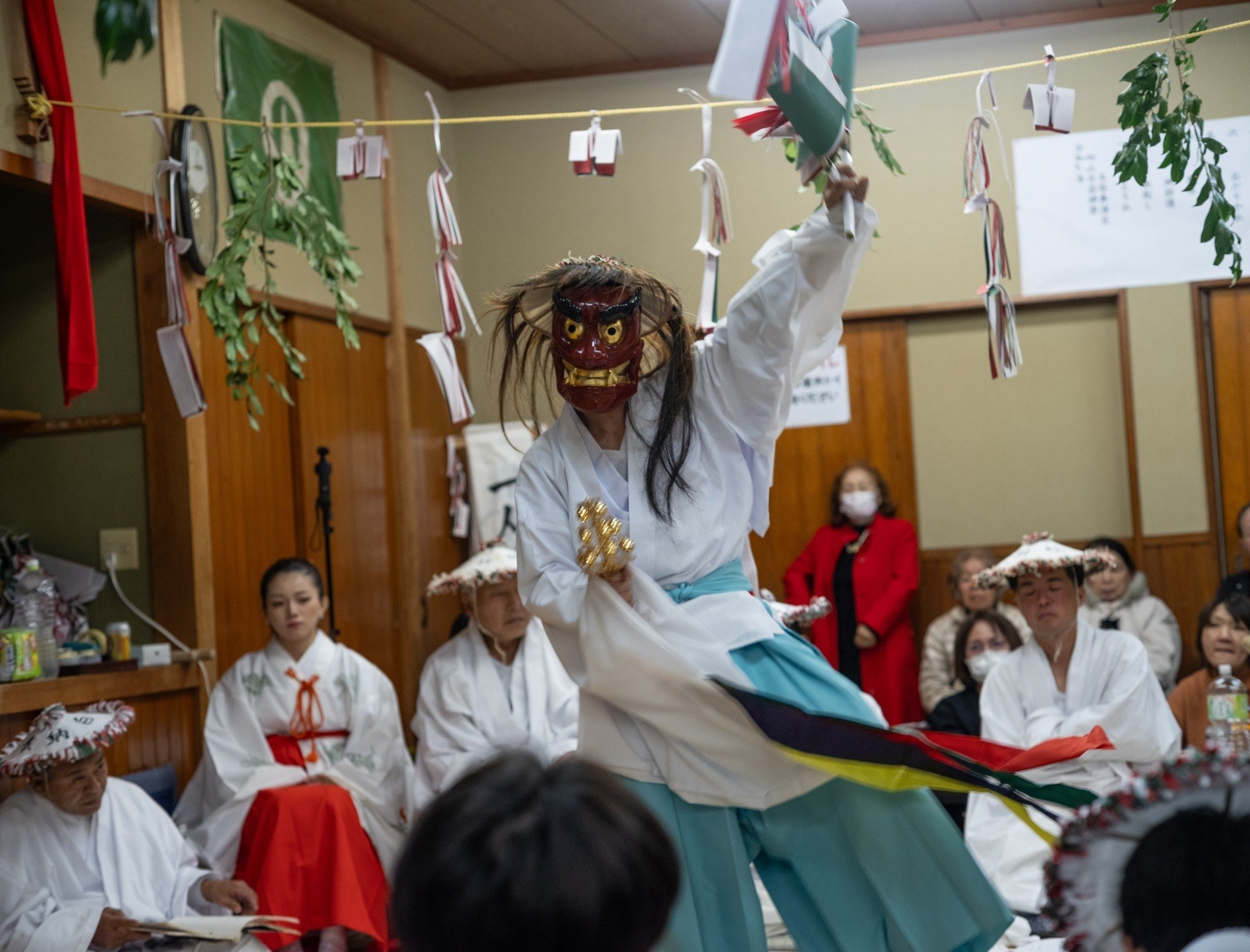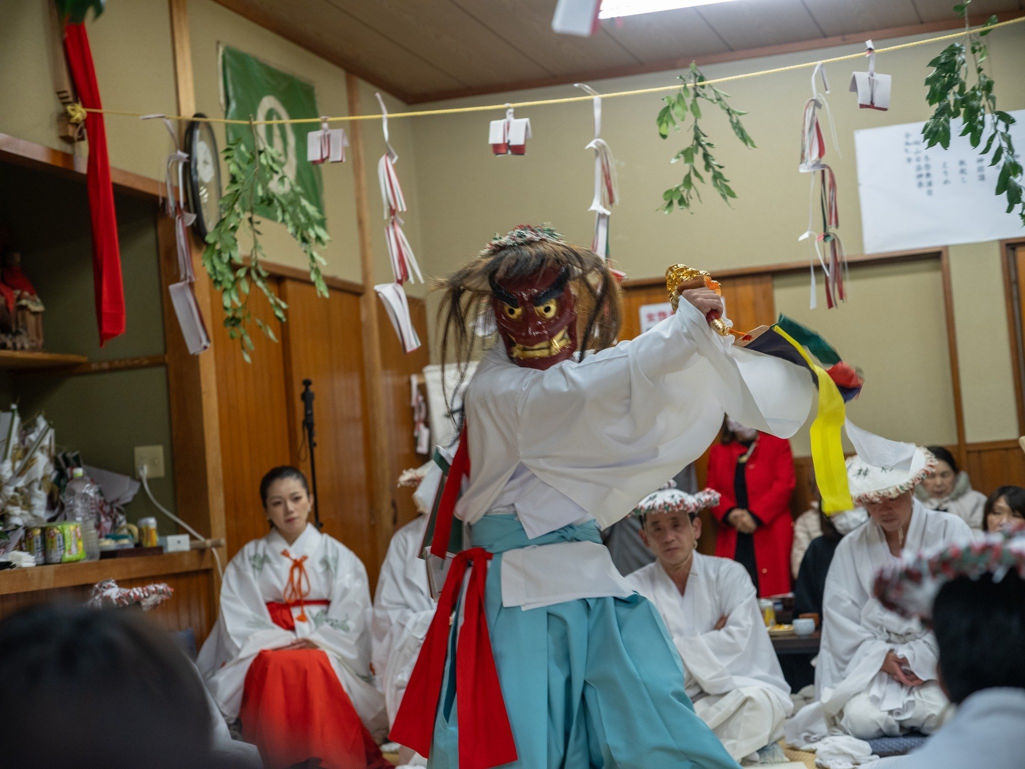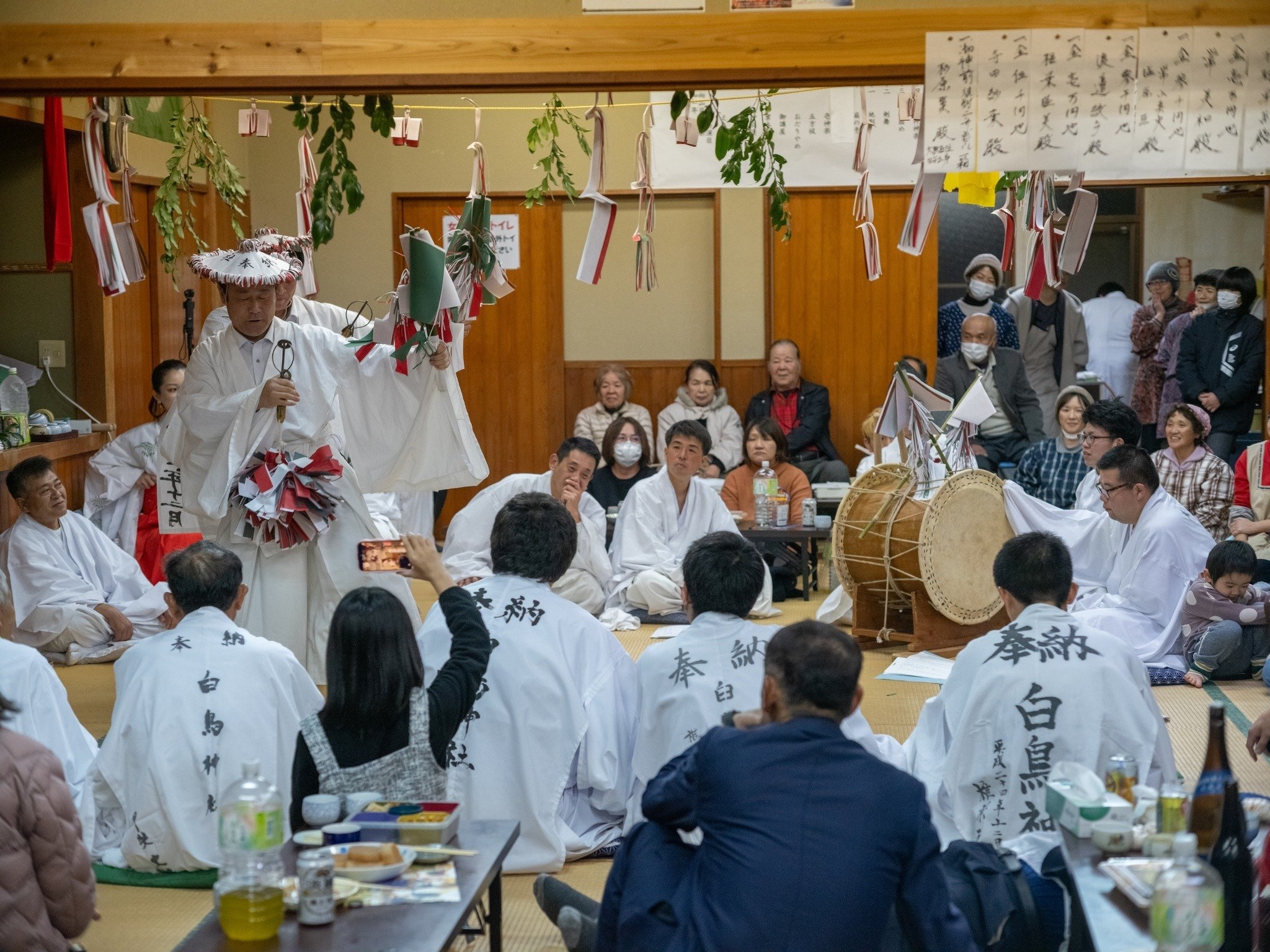 世俗の時間の中で、何かしらのわだかまりや軋轢などが生じていたとしても、この場に集まって、神楽の舞に見惚れ、飲み、語り、笑い、次から次へと出てくるご馳走を食べているうちに、心に残っている塵芥は、溶け消えていくのだろう。
