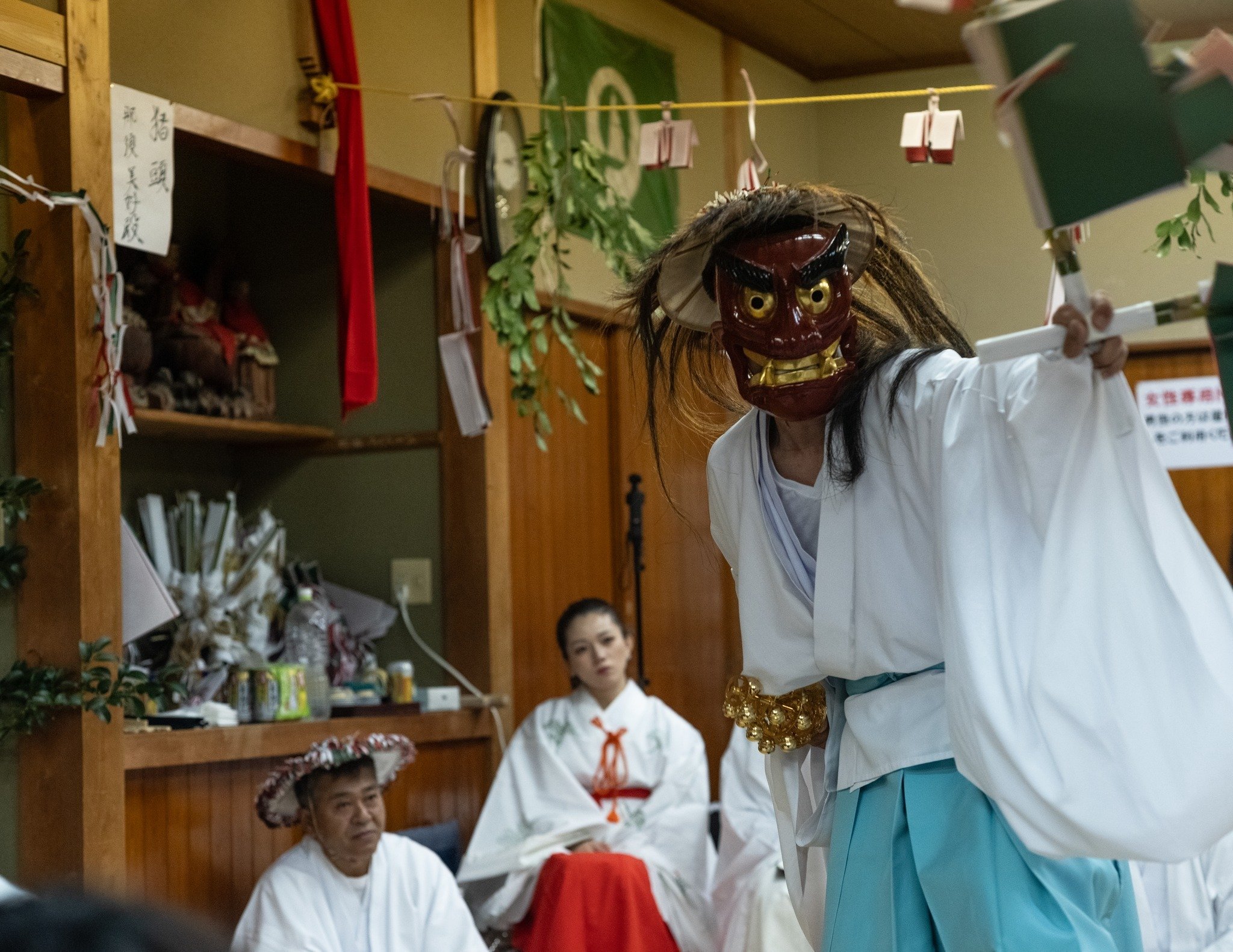 驚いたのは、会場内の人の数がとっても多くて、ストーブを設置していないのに熱気でムンムンしていること。高千穂の夜神楽の時、寒くて辛くて耐えがたかったので、ダウンを重ね着できるように複数枚、されに寝袋も用意したが、まったく必要なかった。外は氷点下の世界なのに。